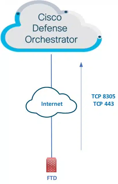 In order to onboard an FTD device to CDO there are some simple pre-requisites. The FTD device is required to be connected to the internet with reachability to domains within *.cdo.cisco.com on the below ports depicted on the diagram in a direction. Without these ports being open the FTD will not be onboarded onto the CDO hosted FMC.