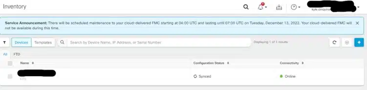 Once the FTD has onboarded with CDO you should see the Device in the inventory. You can now configure and manage your FTD device from the CDO hosted FMC.