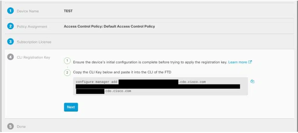 Fill out the required fields making sure to note the CLI key which we will use to paste into the FTD CLI.