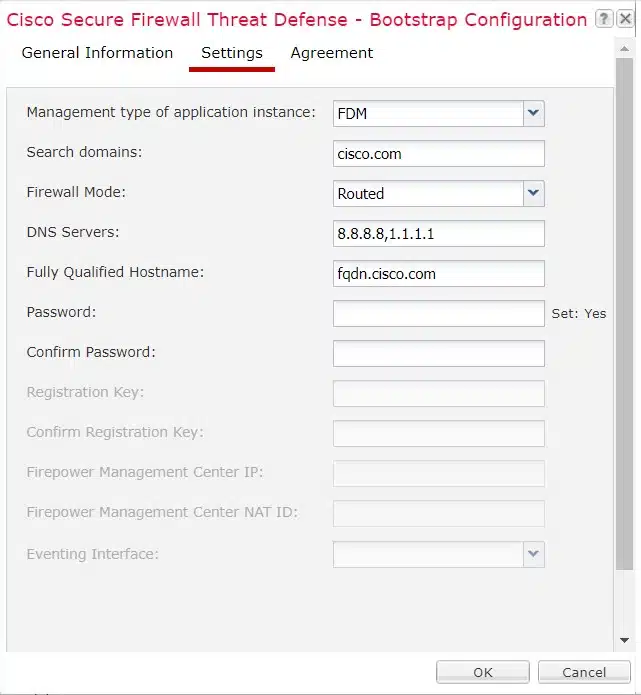 The next step is to configure the settings for the FTD. Initially we will create an FDM locally managed system, however this will change once we get to the CLI of the machine to follow the CDO steps for onboarding the device. In the settings section we also define the domains, DNS servers, passwords and the firewall mode. As we are configuring a perimeter firewall device in this example we will choose Routed mode. Now that the settings are complete create the FTD instance.