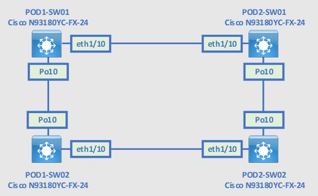 Initially we started by connecting the two PODs together, for our IPN we used Cisco N93180YC-FX-24 devices. As these devices are purely for the IPN we saw no point in wasting resource on 48 Port switches so opted for 2 * 10GB 24 ports running in NX-OS mode. The Intra-pod links were via a port-channel using SFP-H10GB-CU3M and Inter-pod links via single interfaces using 10Gbase-LR.