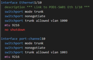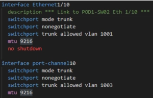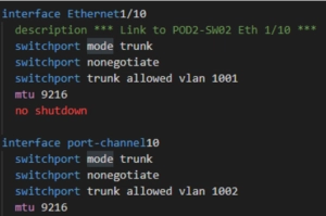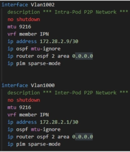 Once the physical interface configuration was in place, we proceeded with the Layer 3 Configuration for communication between the PODs and the ability to share the required routes dynamically using OSPF.