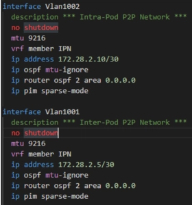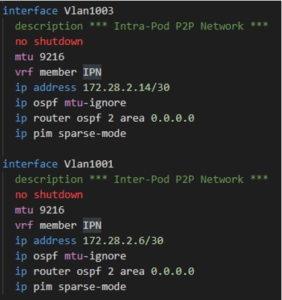 We used /30’s on all Intra and Inter-pod links which were configured on SVI’s inside OSPF Process 2, this was to ensure separation between our IPN and the management network OSPF Process 1. We also created the IPN VRF for use throughout the IPN and in future the ISN – Inter-site Network.