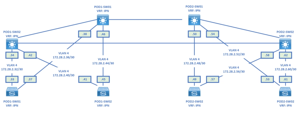 The next step is to physically attach our IPN devices to the ACI Spines on both POD1 and POD2. A connection between the IPN and the ACI Spines is a key part of the ACI Multi-Pod configuration, without this we have 2 separate individual PODs.