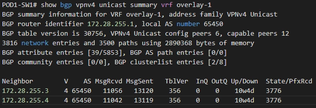 two in each POD so we should see 2 neighbours on each device, these are the spines from the opposing POD. This is important for sharing prefix information East to West and for learning IP and MAC endpoint information across PODs.